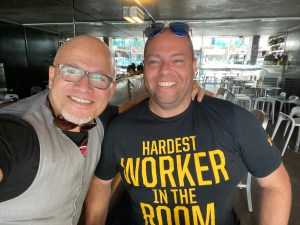 A good teacher is hard to find but finding a good student is even harder. Plan the work – to work the plan. Photo: discussing fine points of one of my programs with retired legend of rugby – Phil Waugh.